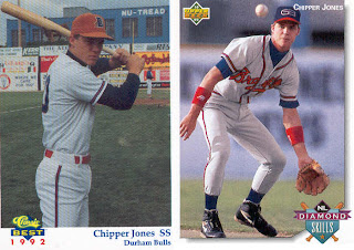 For the 1992 season, Chipper Jones was assigned to the Advanced A Durham Bulls of the Carolina League in Durham, North Carolina and was later promoted to the AA Greenville Braves of the Southern League in Greenville, South Carolina. Over the course of 70 games with the Durham Bulls, Chipper Jones amassed 301 plate appearances and registered 264 official at-bats. Jones scored 43 runs on 73 base hits, 22 doubles, 1 triple, and 4 home runs. He also had 31 runs batted in. Jones stole 10 bases. He drew 31 walks. Jones had a batting average of .277, an on base percentage of .353, and a slugging percentage of .414. He amassed 109 total bases and was intentionally walked one time. Also featured on the 1992 Durham Bulls roster were future Major League players Tyler Houston, Brian Kowitz, Melvin Nieves, Kevin Lomon, Mike Potts, Carlos Reyes, and Brad Woodall. The 1992 Durham Bulls finished with a record of 70-70. Over the course of 67 games with the Greenville Braves, Chipper Jones amassed 285 plate appearances and registered 266 official at-bats. Jones scored 43 runs on 92 hits, 17 doubles, 11 triples, and 9 home runs. He also had 42 runs batted in. Jones stole 14 bases. He drew 11 walks. Jones had a batting average of .346, an on base percentage of .367, and a slugging percentage of .594. He amassed 158 total bases and was intentionally walked one time. Also featured on the 1992 Greenville Braves roster were future Major League players Brian Bark, Mike Bell, Pedro Borbon, Ramon Caraballo, Kevin Coffman, Donnie Eliott, Ed Giovanola, Pat Gomez, Mike Kelly, Brian Kowitz, Javy Lopez, Greg McMichael, Nate Minchey, Mike Mordecai, Melvin Nieves, Eddie Perez, Tony Tarasco, Scott Taylor, Jeff Treadway, and Brad Woodall. The 1992 Greenville Braves finished with a record of 100-43 and won the Southern League championship.